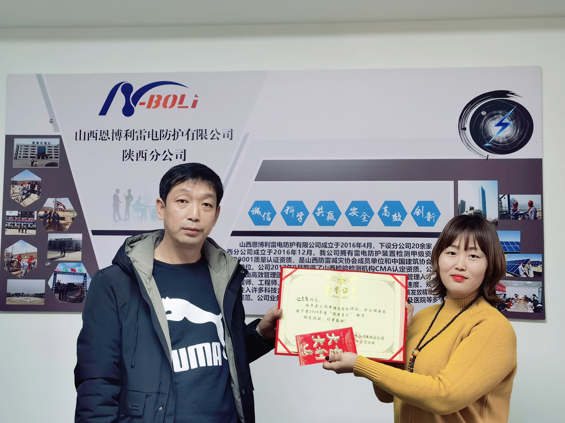 (图为陕西分公司负责人李爱军为“2019年度优秀员工”荣誉获得者任育育颁奖)